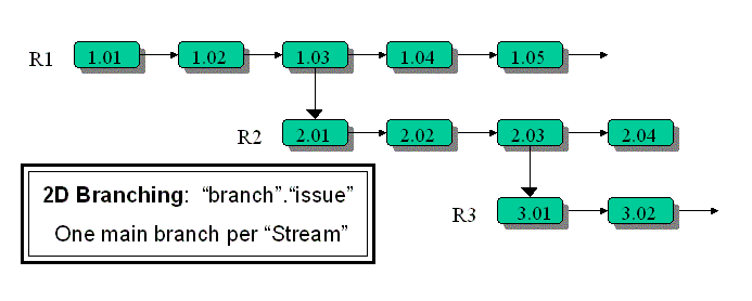 Establish a Product Road Map It's too easy to use ad hoc Branch Labelling or Directory Copying to define and freeze releases. As support issues arise and as you realize that your verification failed to uncover some significant bugs, the multiplication of branches and re-releases sets in. What you really want is an overall game plan. Your product needs a release strategy that is driven by market and support requirements, not by your tool, team or process capabilities - the latter should fall out of your requirements. Your design architecture will play a significant role in how quickly you can react to these requirements, but you need a Product Road Map up front, one that is simple, but flexible. Many (most?) shops define a "main" branch and develop out of the branch, merging back in, and perhaps branching again to define a release or to support a release. It seems like a simple strategy because there's a single main branch. And if release dates and criteria could be cast in stone and customer variant requirements minimized, this might be a successful model. But in the real world, the release process is a long parallel-stream process. The single main branch model is very complex precisely because it does not map on to the real world requirements where development teams need to be working on a new releases even before the previous release has made it out of QA. So let's start with a different framework. Look at the Product Road Map - jump 5 years ahead if you need to. Release 3 is in the field. Release 4 is in verification, almost ready for beta, and work on release 5 has started. Three parallel release streams, all needing support - perhaps more in the future. The support team may be trying to move users on to the latest release, but it knows that it will have to maintain parallel streams. And it doesn't want the support process for one release stream to change just because a new release stream has started. Rather than using a main-branch centric process, try the following. Look at the Product Road Map. What does it say about how you need to roll out and support releases of your product. The roads can actually run in parallel. They don't have to run end to end (i.e. main branch) with a sudden left turn everytime you need to define a support point.