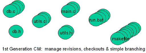 If you're building a Missile Defense System, a new generation of Aircraft, or a tamper-proof Financial System, you'll want to position yourself to best take advantage of new technology. Lets take a brief look at the past and present to prepare us to look into the future. First Generation CM The first generation of Configuration Management tools dates back to the late 1960s and the 1970s, with SCCS (Unix), then RCS and a number of mainframe capabilities such as CMS (VMS). Through the 1970s, CM began to take a formal foothold. Most solutions were still in-house solutions, but usually based on a basic version control program such as SCCS. The initial set of CM tools provided the most basic Version Control and Build facilities. These were typically a collection of tools, sometimes formally grouped, sometimes informally grouped. First Generation CM tools are identified by the following properties.