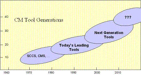 Beyond the Fourth Generation Beyond the 4G CM tool, we'll see the CM centric system grow into an Enterpise Management System. Expect to see an expansion of functionality to support a wider definition of product management, including Time Sheet Management and Analysis, Budgeting, Risk Management, Integrated Quality Assessment, Web Site Management, ITIL compliant CM Deployment, HR Management and Sales Tracking, which has no other place to attach itself. The expansion of CM tools into these areas will occur as XRAD (eXtremely RAD) capabilities are bundled with the CM capabilities. Organizations, large and small, will have the capability to rapidly define and customize their applications and processes using the same repository and tools used in their CM and product management environments. From a useability perspective, more and more non-technical users will find that they can benefit from Change Control and Configuration Management: lawyers, accountants, media content providers, and so forth. A few simple operations from the Operating System menus (save my work, show my history, show a change, yank a change, etc.) will make this possible. The CM engine will move to a more center stage position within the OS. Disaster Recovery will give way to Continuous Operation. Take down one site and end-users won't notice - like card and shelf redundancy in high reliabilty telecom and aerospace products. So Where Are We Now So we have painted a grand plan. Is it likely to be followed? It doesn't really matter. What matters is getting the ideas on the table so that the market place starts demanding them. This is what will ultimately drive the industry. Users are too focused on their own shops and problems to be able to paint this plan. Vendors and Consultants see dozens, if not hundreds of sites per year - they must interact with users to form this vision, and not simply to meet today's requirements. But in the mean time, we need to understand where we are now. There are dozens of tools, and each has their strengths. With input from others, this author will attempt to refine the definition of CM generations so that we can measure our existing tools and get a real idea of what it means to leap from one generation of CM to another. One goal will be to be able to compare CM tools more objectively. Perhaps you disagree with some of these projections, or perhaps you see them happening along different timelines. I welcome your input.