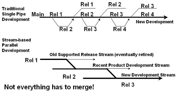 This is too much. If I've got branches of all types, I've got merges of all types, and I've also got labels of all types. There are baseline labels, release labels, change and feature/fix labels, promotion level labels, and so forth. Some can be applied multiply to the same file, some are one of, others need a whole set of files before they can make sense. So... enter the branching strategy document. It helps make sense out of labels. It helps make sense out of branching. It tells me what happens when a new release stream is to be opened up. I can use it to implement triggers to help support and enforce the strategy. The problem is, it takes too long to put together and review, unless your team has been through this a number of times already. And it's too complex, not for developers to understand, but for developers to use their precious time trying to read/review, understand and apply it, when there are other, more urgent things to do. And then it the strategy changes to deal with the unforeseen. It should all just be intuitive. But then, how would you ever design the right configuration specification? You could borrow it from your peer, I suppose. Well, there is a better way. It requires understanding and modeling the process better. Don't use branches for everything. More Branches, Less Branching? Let's start out by saying you can actually reduce branching and merging by using more branches. I know that sounds contradictory. What I'm refering to is the "main" branch strategy. Many will advocate keeping a single main branch always. Then most development is done on the same branch, "main." Sounds easy. I don't agree, at least in most cases. I prefer the "step" model, where each major release development stream has its own main branch. So instead of one "main" branch, you have a rel-1 branch, a rel-2 branch, and so forth. Maybe you introduce a rel-1.5 branch at a later point. Some say, this is not really different. Instead of starting a rel-2 branch and continuing support on the rel-1 branch, you transition the "main" to handle "rel-2" and create a new branch for "rel-1" support, if and when necessary. Then your developers just continue to work on "main." But when it comes down to it, each feature implementation or problem/issue/defect fix has to be targeted to a given release (stream), and possibly more than one. Rather than implementing release 1 changes on a release 1 branch, release 2 changes on a release 2 branch, and so forth, you look at the state of "main" and decide where to make the change. So for a release 2 change, if "main" is still tracking release 1, you need to use a release 2 branch. That branch is then merged into the "main" when it starts tracking release 2. When "main" starts tracking release 3, you're back to using a release 2 branch again. On top of that, there are all sorts of timing issues - when to switch main, for example - and issues - get your release 1 changes in so we can close down main for release 1 and open up release 2. Then there's the identification issue. Is 1.33 a release 1 or a release 2 or what revision? In the branch per release stream model, you have 1.1 to 1.N are release 1, then 2.1 to 2.N are release 2, and perhaps 3.1 to 3.N (or in some systems 1.1.1.1 to 1.1.1.N) are release 1.5. Not a perfect mapping perhaps, but at least you can tell without having to consult the branch history. Then there's the "how do I make a change to release 2?" issue. The answer is simple. In the "main" strategy, it depends. In the branch per release stream strategy, you go to the release 2 stream. On top of all of that, there the extra merging. Changes made to the release 2 stream before it became mainstream have to be artificially merged to the main stream. And what happens when I try to look at the history of such a merged file. There are now two paths backwards to the ancestor - one through the release 2 branch, the other through the release 1 branch. Which one is more meaningful? Some complain that with the step model, your branching is getting deeper and deeper all the time. That's just a naming convention. You're history is growing all the time, regardless of the model you use. But your branching isn't getting deeper. Neuma's CM+ for example, uses two-dimensional branching whereby, although they remember the branch point for each branch, each one gets a top level identifier so that you can always express a particular revision using the branch id plus the relative revision number (2.12, ab12, r2-12, etc. depending on the format you choose to use). When you look at a file history, you have a nice 2-dimensional tree, with branches being a first order object, and revisions underneath each branch. These may appear to be minor issues, but they cascade on one another. For example, some will hold off making release 2 changes until release 2 is the main branch, causing unwarranted delays. Others may be prevented from checking in their changes because of the state of flux of main, causing, perhaps, the need for parallel checkouts and reconciles where none should have been required. It doesn't take a lot of complexity to complicate a model - just a few little things here and there and some people will get confused and make mistakes, which then have to be unravelled.